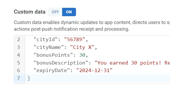 لتضمين بيانات مخصصة في إشعارك، ما عليك سوى تبديل البيانات المخصصة إلى وضع التشغيل وإدراج بيانات JSON الخاصة بك في حقل البيانات المخصصة.