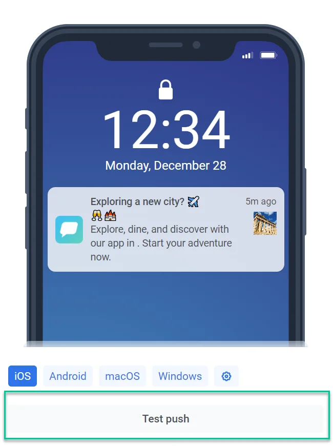 للتأكد من أن إشعاراتك تم تكوينها بشكل صحيح وتظهر كما هو متوقع، أرسل إشعارًا تجريبيًا إلى جهاز مخصص باستخدام ميزة إشعار تجريبي. تعرف على المزيد حول الأجهزة التجريبية