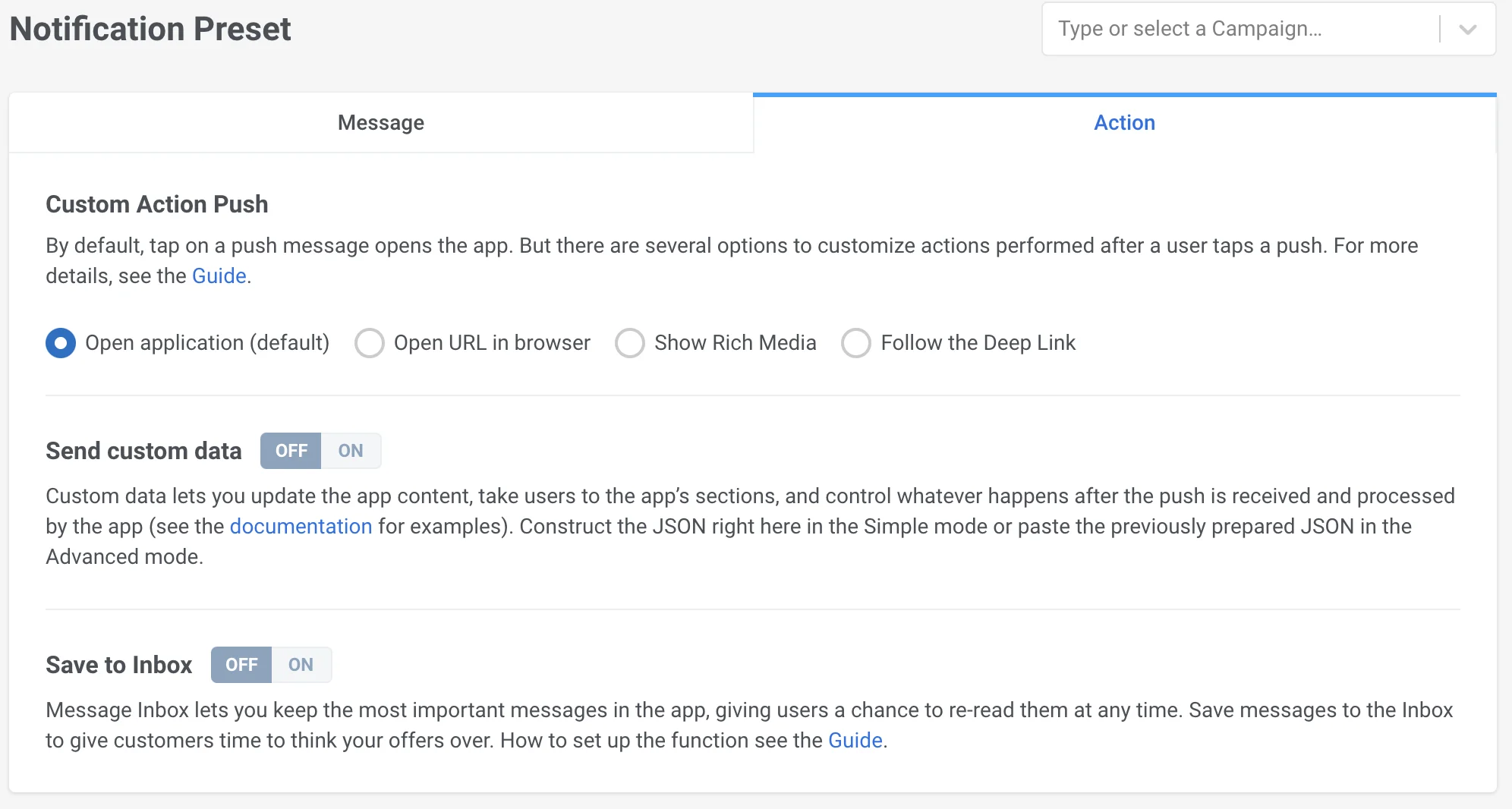 Anchor link toتتكون جميع الإعدادات المسبقة من محتوى (علامة التبويب الرسالة) وإعدادات إشعارات إضافية (علامة التبويب الإجراء).