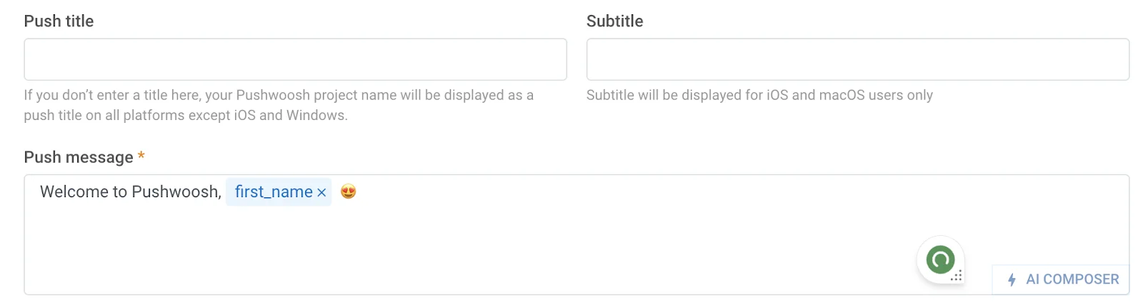 Anchor link toيسمح لك Pushwoosh بتخصيص عناصر الإشعارات مثل العناوين والعناوين الفرعية والرسائل. هذا يعني أنه يمكنك تخصيص المحتوى الخاص بك للمستخدمين الفرديين لتجربة أكثر جاذبية. لهذا: