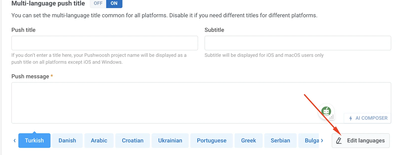 Anchor link toيعرف Pushwoosh اللغات التي تم تعيينها على أجهزة المستخدمين. اللغة التي يمتلكها معظم المشتركين على هواتفهم هي اللغة الافتراضية. إذا كنت ترغب في إرسال إشعار بلغات مختلفة، فانقر فوق تحرير اللغات لعرض جميع اللغات المتاحة بالإضافة إلى عدد الأجهزة بجانبها.