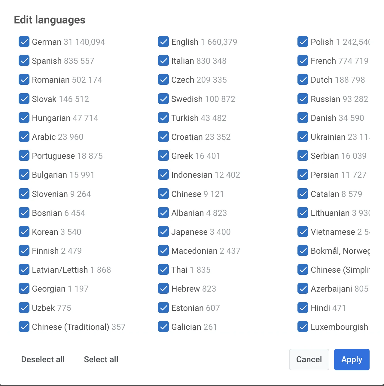 بشكل افتراضي، يتم تحديد جميع اللغات. قم بإلغاء تحديد المربعات إذا كنت لا ترغب في ترجمة إشعارك إليها. ثم انقر فوق تطبيق.