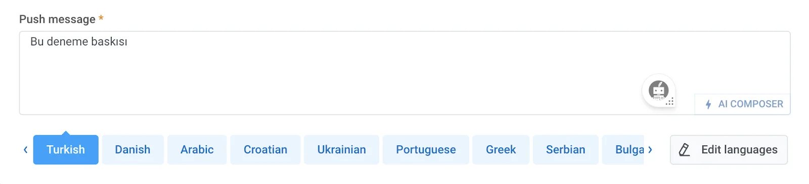 Anchor link toهذه هي الرسالة التي سيتلقاها المستخدمون في إشعارك. هنا، يمكنك إدخال نص ورموز تعبيرية، وإنشاء رسالة باستخدام مؤلف الذكاء الاصطناعي، وإضافة تخصيص (مرحبًا {first name}) وإصدارات مترجمة من رسالتك بلغات مختلفة.