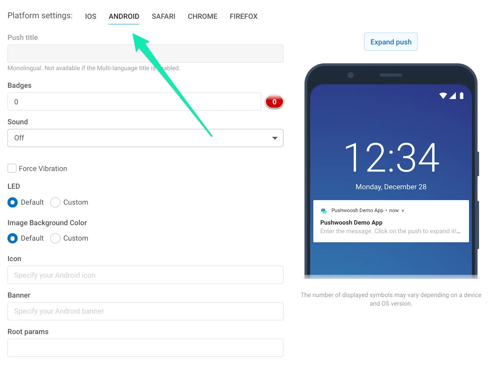Anchor link toيوفر محرر محتوى الإشعارات طريقة ملائمة لتصور كيف سيظهر إشعارك على أجهزة المستلمين. ما عليك سوى اختيار المنصة المستهدفة التي ترغب في معاينة الإشعار عليها (على سبيل المثال، Android، iOS).