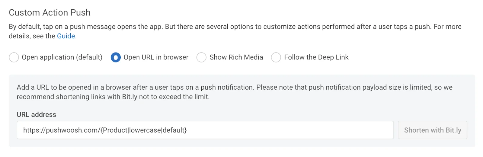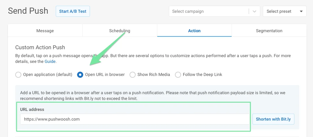 هنا، يمكنك إضافة رابط سيتم فتحه في متصفح بعد أن ينقر المستخدم على إشعار. اختر خيار URL وأدخل عنوان URL في الحقل المقابل. يرجى ملاحظة أن حجم حمولة الإشعار محدود، لذا فكر في استخدام أداة تقصير عناوين URL للبقاء ضمن الحد المسموح به.