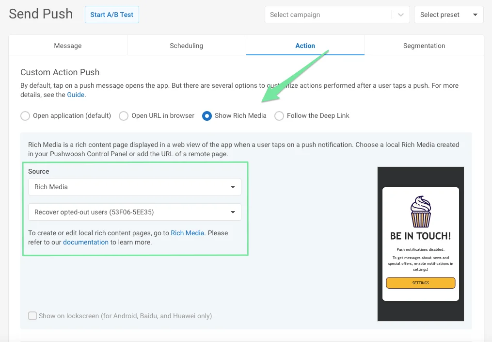 يمكّنك Pushwoosh من إنشاء محتوى إشعارات قابل لإعادة الاستخدام. يمكنك صياغة النص وتكوين الإعدادات باستخدام محرر محتوى الإشعارات الخاص بنا. يمكنك بعد ذلك إما إرسال الإشعار فورًا أو حفظه للحملات المستقبلية.