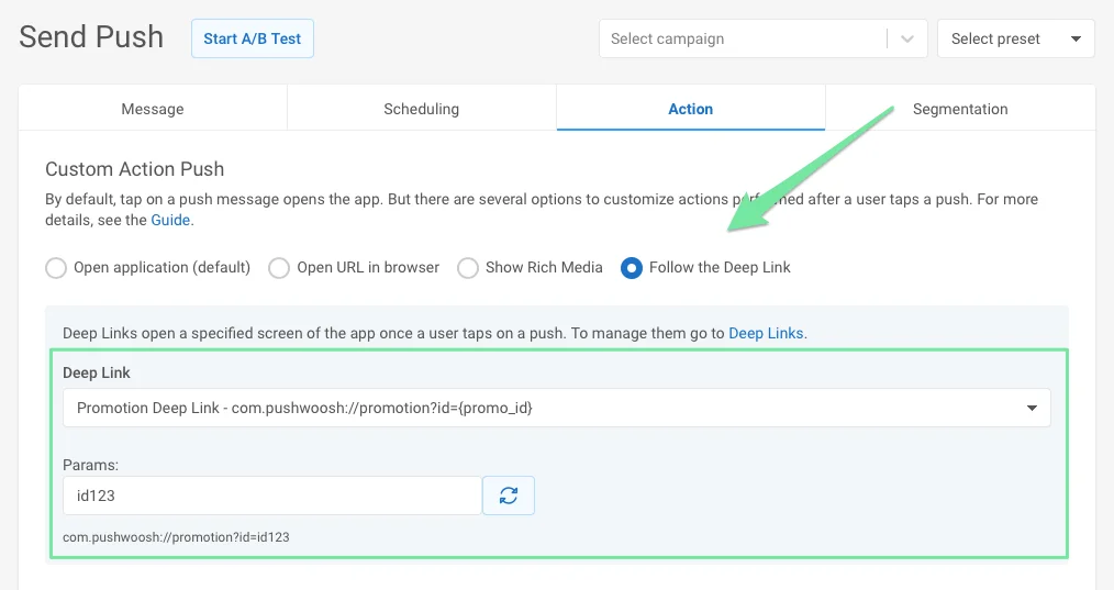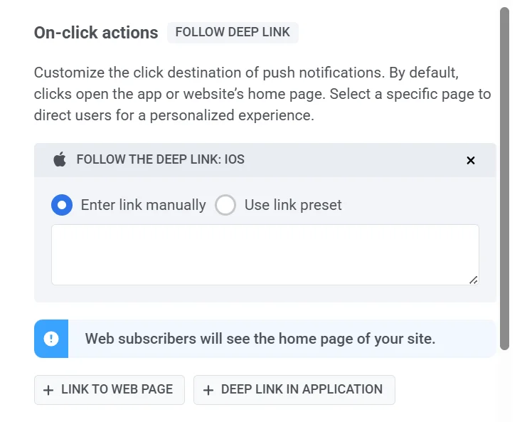 Anchor link toباستخدام الروابط العميقة، يمكنك نقل المستخدمين مباشرة إلى محتوى جديد داخل التطبيق وصفحات ترويجية وعروض خاصة وما إلى ذلك. في الإعدادات المسبقة، يمكنك فقط إضافة الروابط العميقة التي قمت بتكوينها في الإعدادات.