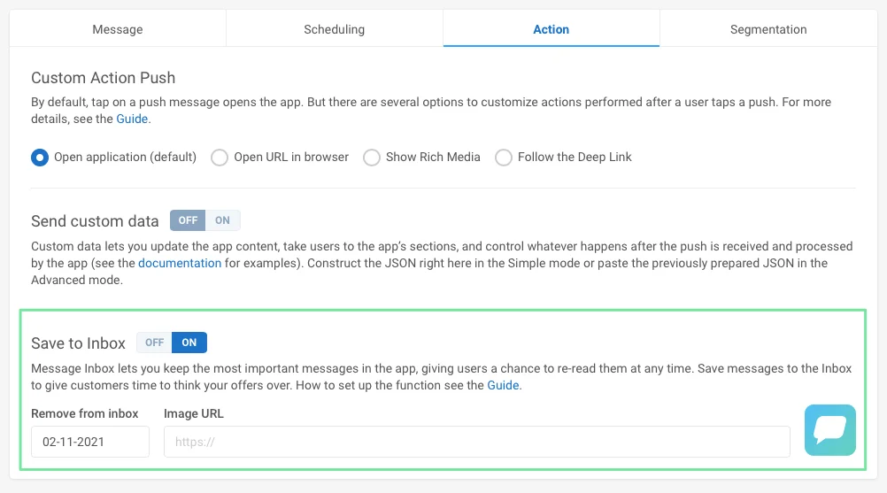 Anchor link toللاحتفاظ بالرسالة في صندوق وارد المستخدمين، حدد مربع الاختيار وقم بتعيين تاريخ إزالة الإشعار. بشكل افتراضي، تتم إزالة الرسائل من صندوق الوارد في اليوم التالي لإرسالها. لتعيين أيقونة ليتم عرضها بجوار الرسالة في صندوق الوارد، حدد عنوان URL للصورة في الحقل المقابل.