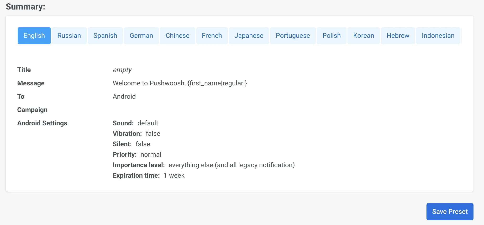 على سبيل المثال، إذا كانت لغتك الافتراضية هي الإنجليزية ولكنك تريد الوصول إلى المتحدثين بالإسبانية والألمانية أيضًا، فأضف تلك اللغات إلى إشعارك. سيتلقى المستخدمون الذين لديهم إعدادات هاتف إسبانية أو ألمانية الرسالة بلغتهم المفضلة، بينما سيرى الآخرون الإصدار الإنجليزي الافتراضي.