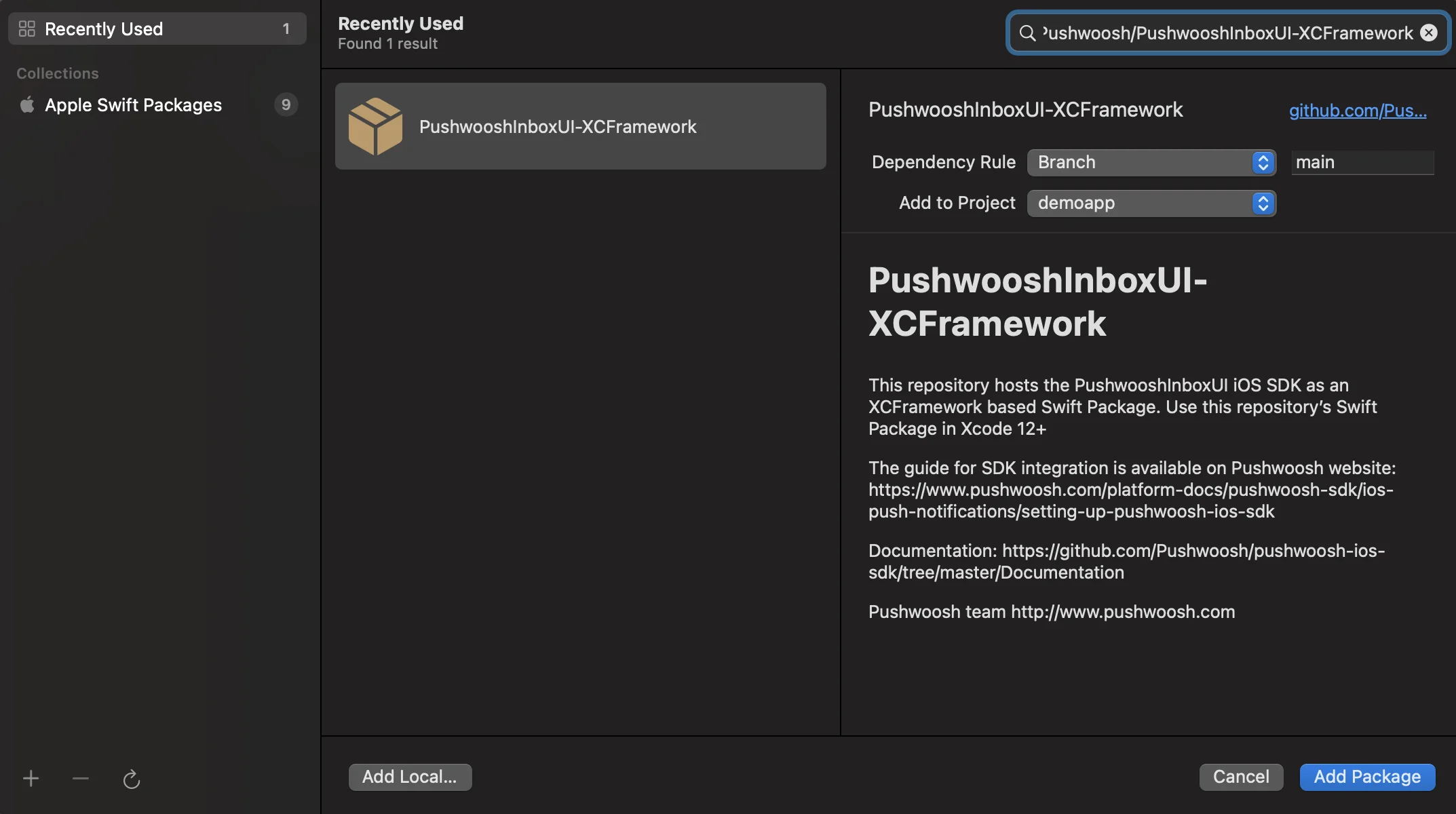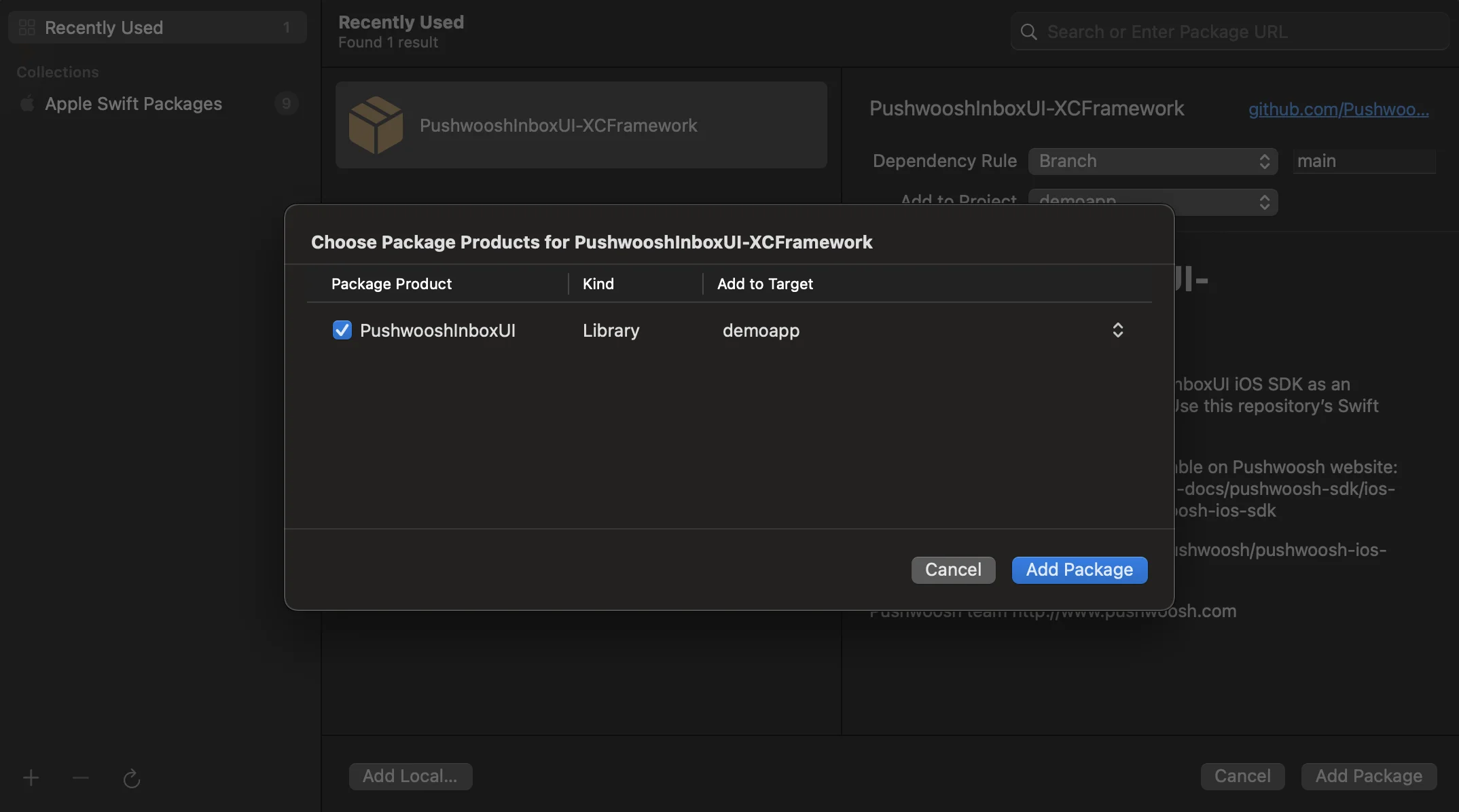 https://github.com/Pushwoosh/PushwooshInboxUI-XCFramework- Stellen Sie die ‘Dependency Rule’ auf Branch und main ein. Klicken Sie dann auf die Schaltfläche ‘Add Package’.