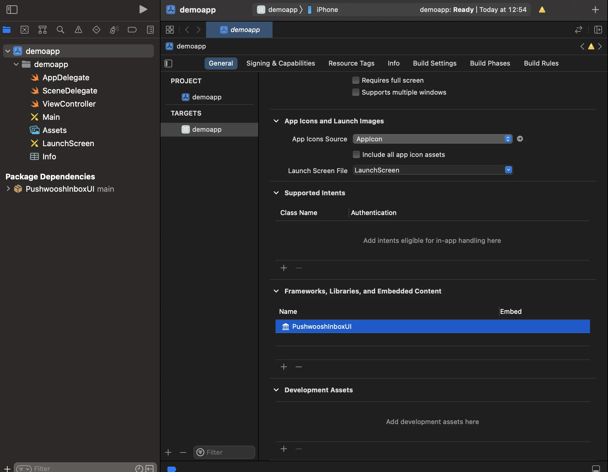 - Öffnen Sie Ihr Haupt-App-Ziel (Target) und stellen Sie unter „Frameworks, Libraries, and Embedded Content“ sicher, dass PushwooshInboxUI hinzugefügt wurde.