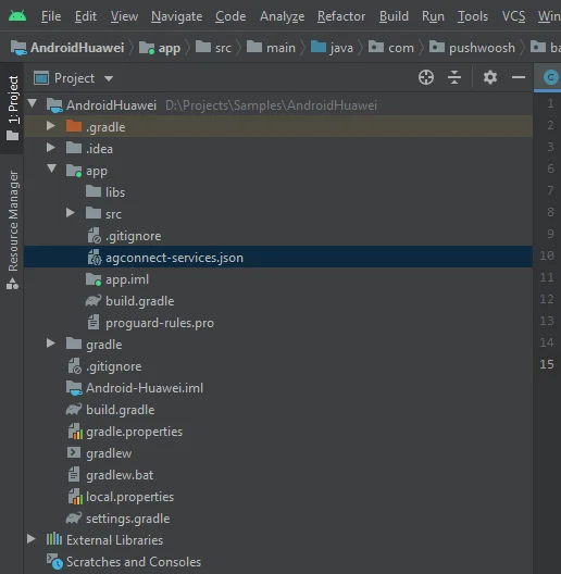 - Coloque el archivo descargado en su proyecto de Android Studio (SU_PROYECTO/app/agconnect-services.json).