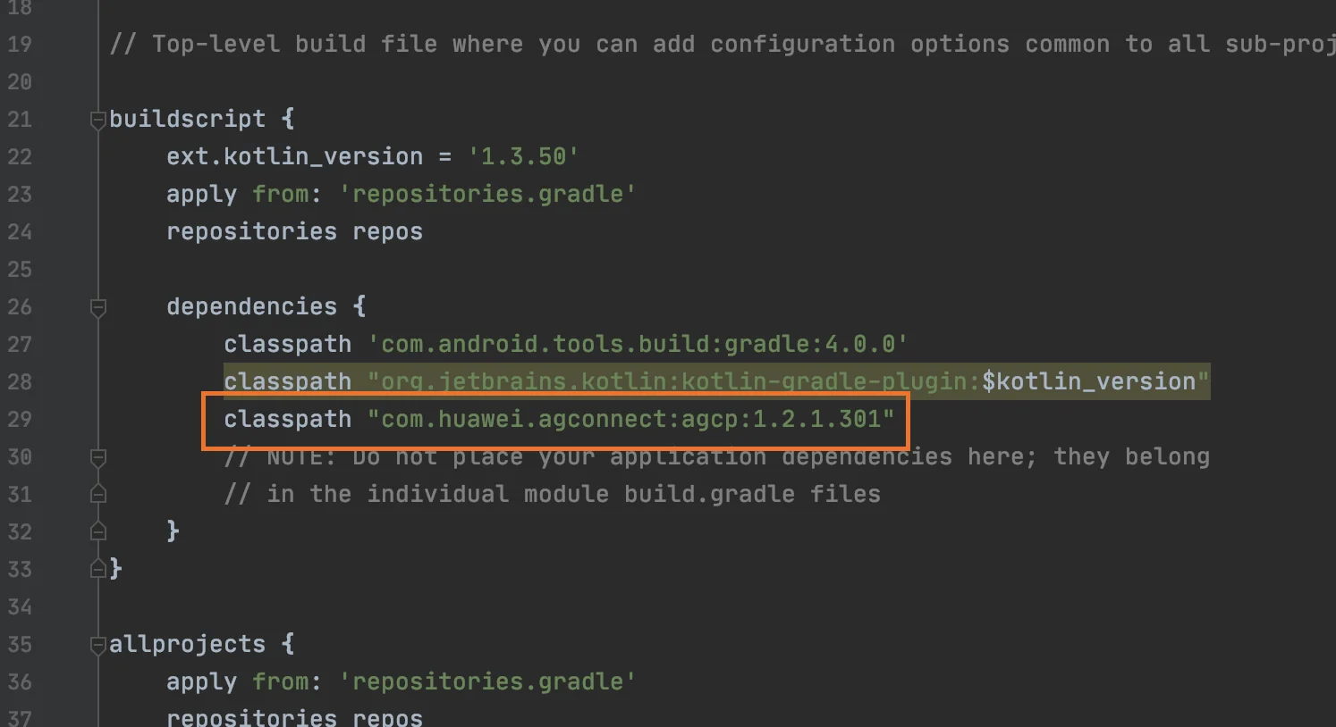 Anchor link to- Añada classpath “com.huawei.agconnect:agcp:1.2.1.301” al archivo android/build.gradle de buildScript/dependencies.