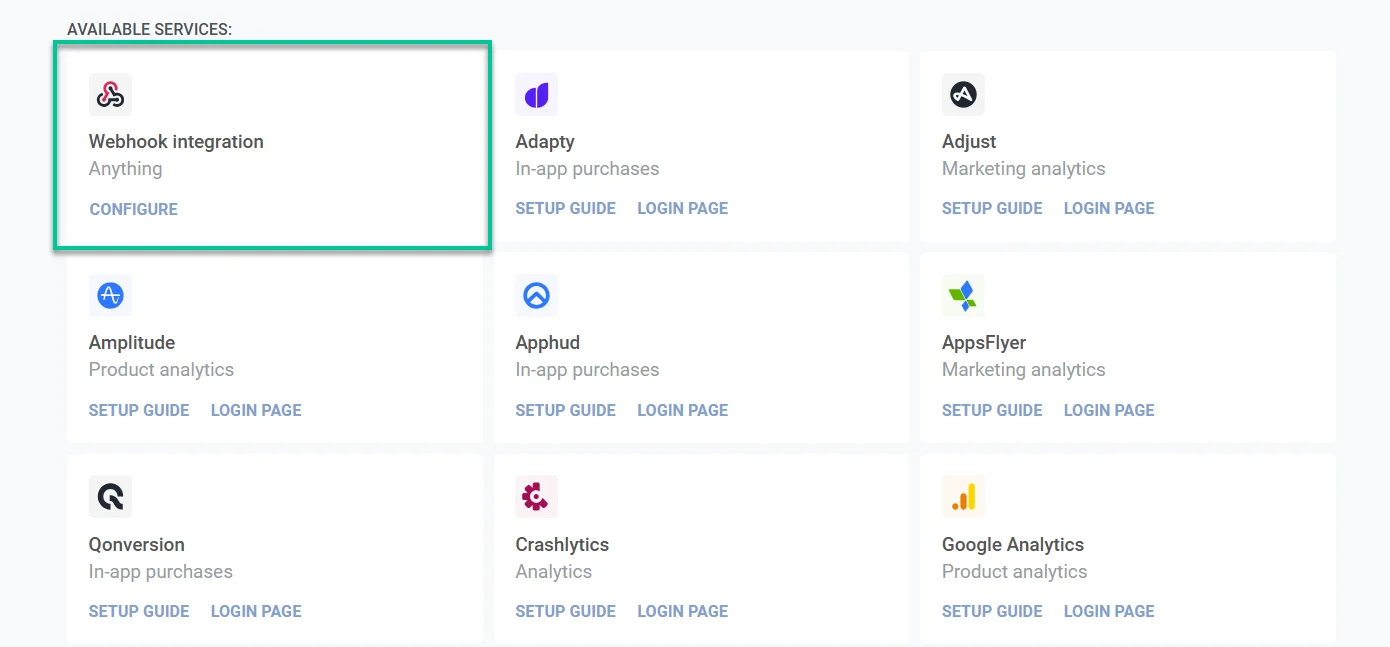 - Dans votre compte Pushwoosh, allez dans Paramètres > Intégrations tierces et trouvez Intégration Webhook. Cliquez sur Configurer.
