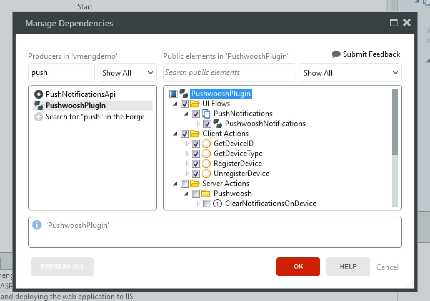 Anchor link to- अपने एप्लीकेशन में, Pushwoosh प्लगइन का रेफरेंस जोड़ने के लिए “Manage Dependencies…” का उपयोग करें।