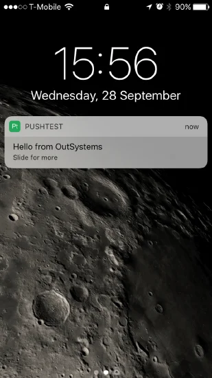 उदाहरण के लिए, यदि आप इस एक्शन का उपयोग “PushTest” नामक एप्लीकेशन को “Hello from OutSystems” संदेश भेजने के लिए करते हैं, तो iOS में निम्नलिखित दिखाया जाएगा: