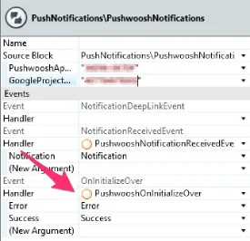 “PushwooshNotifications” ब्लॉक जोड़ते समय, इसे प्लेसहोल्डर्स के अंदर जोड़ने से बचें, क्योंकि कुछ केवल डिज़ाइन टाइम पर उपलब्ध होते हैं और, रनटाइम पर, Pushwoosh काम नहीं करेगा।