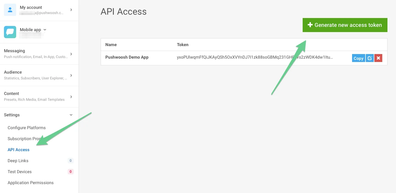Anchor link toनोटिफिकेशन भेजने के लिए, आपको एक Pushwoosh API एक्सेस टोकन की आवश्यकता है। Pushwoosh कंसोल पर जाकर, “API Access” पर जाकर, और “Generate new access token” पर क्लिक करके एक बनाएँ।