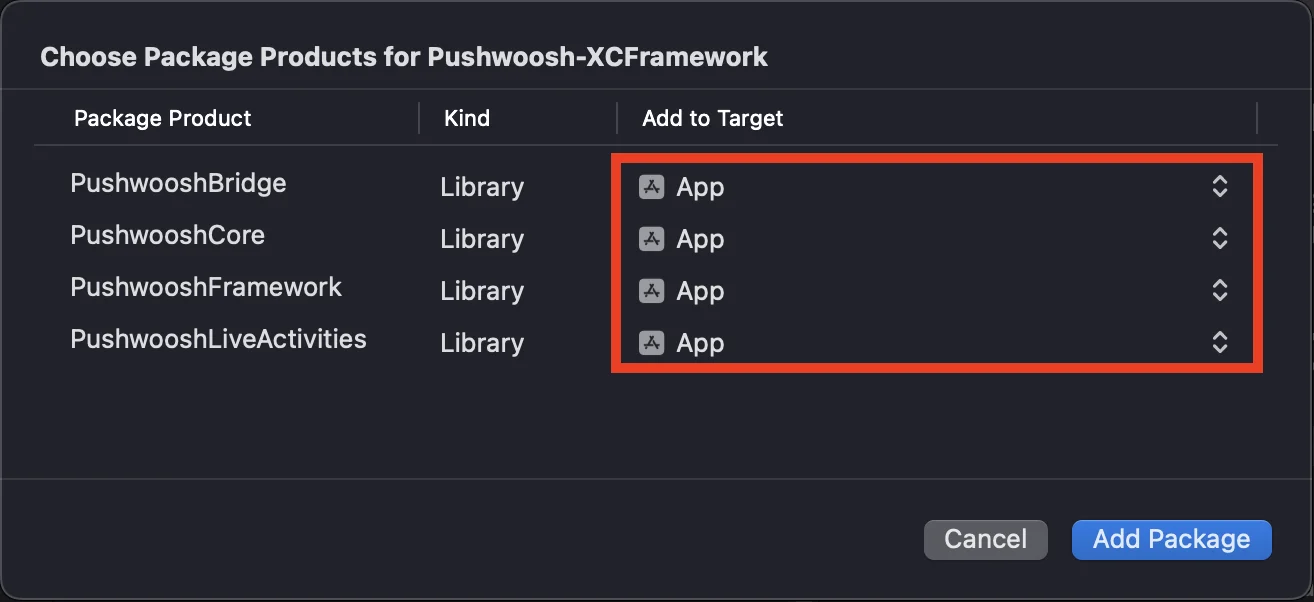 https://github.com/Pushwoosh/Pushwoosh-XCFramework要使用 Pushwoosh iOS SDK,请确保在通过 Swift Package Manager 集成时将以下四个框架添加到您的应用程序目标中: