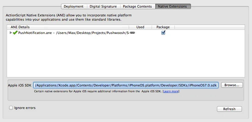 ]]> </manifestAdditions> <colorDepth>16bit</colorDepth></android>7. 설정의 “네이티브 확장” 창에서 “패키지” 체크박스를 선택했는지 확인하세요. 또한 iOS용으로 내보낼 때 아래 스크린샷에 따라 최신 iOS SDK 경로를 선택하세요: