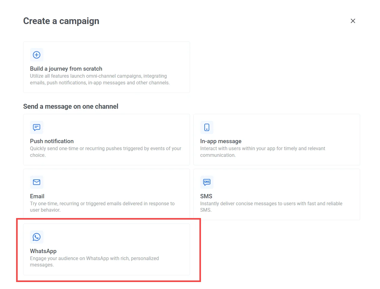- 캠페인 > Customer Journey Builder > 캠페인 만들기 > WhatsApp으로 이동합니다.