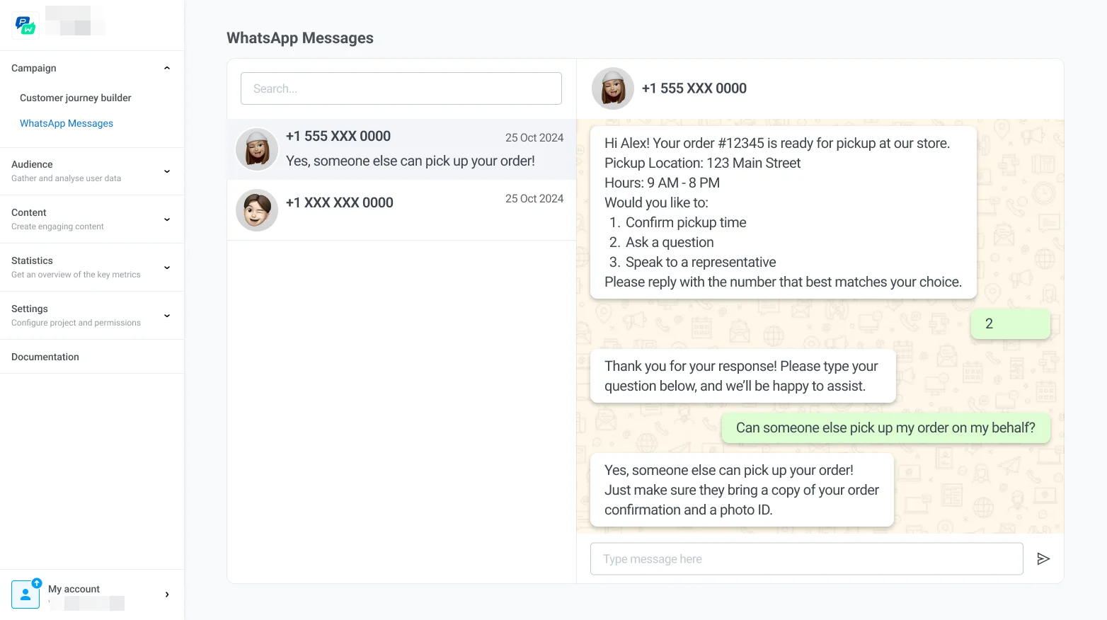 Anchor link to자유 형식 메시지를 보내고 WhatsApp 대화를 보려면 Pushwoosh의 WhatsApp 메시지 섹션으로 이동하세요.
