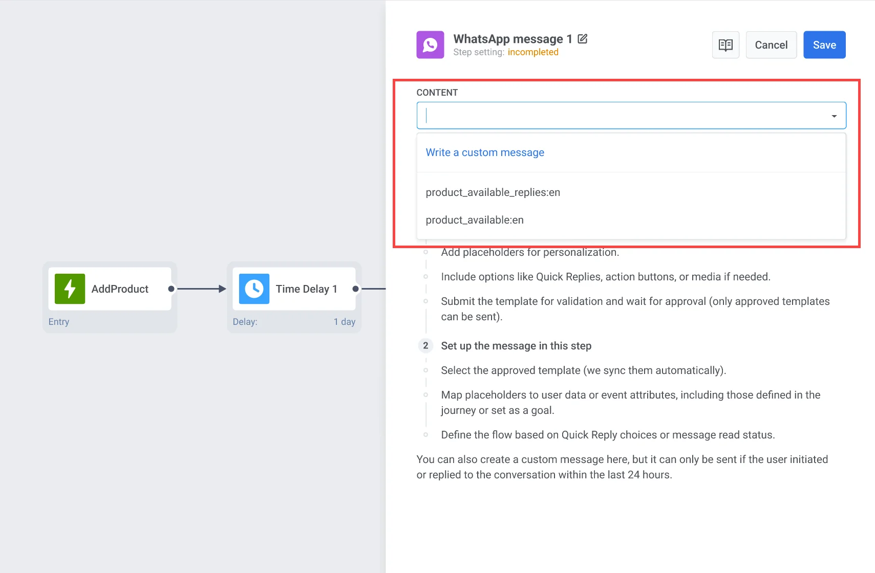 드롭다운에서 사전 승인된 WhatsApp 메시지 템플릿을 선택합니다. 템플릿은 선택한 언어로 제공되어야 하며 WhatsApp의 승인을 받아야 합니다.