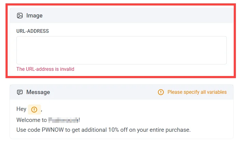 중요: 액션 URL의 모든 플레이스홀더에 변수가 할당되었는지 확인하세요. 구성되지 않은 플레이스홀더가 있으면 메시지가 전송되지 않습니다.