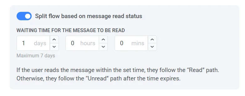 - 읽음 상태에 따라 분할하려면 메시지 읽음 상태에 따라 플로우 분할 옵션을 활성화하고 대기 시간(최대 7일)을 구성하세요.