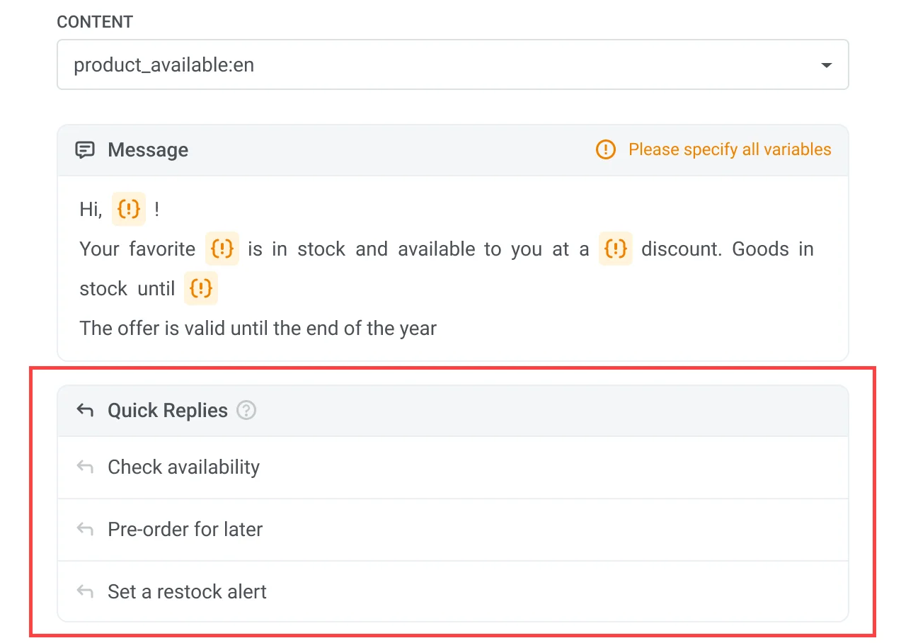 예를 들어, 메시지가 “새로운 혜택에 대해 더 자세히 알고 싶으신가요?” 라면 다음과 같은 빠른 답장 옵션을 구성할 수 있습니다: