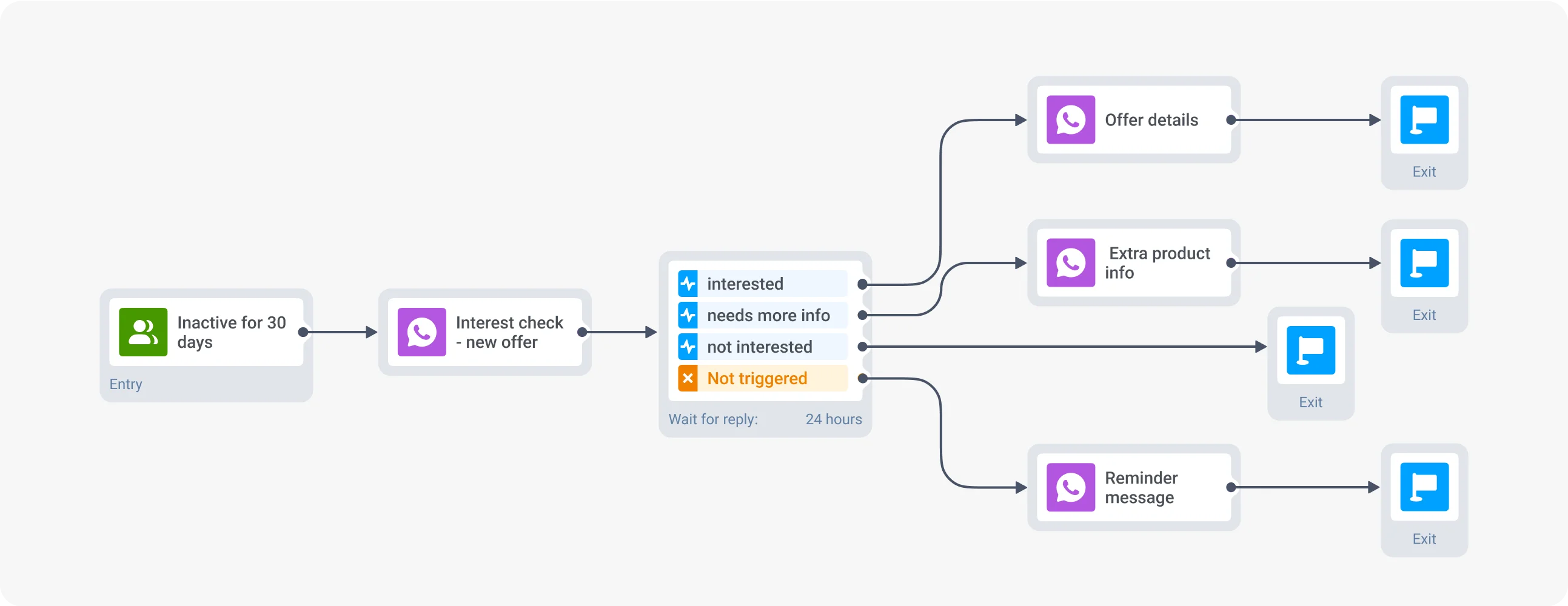 Anchor link toWhatsApp의 빠른 답장을 사용하면 사용자에게 미리 정의된 응답 옵션을 제공할 수 있습니다. Pushwoosh Customer Journey Builder를 사용하면 각 빠른 답장이 별도의 사용자 Journey 플로우로 이어지도록 설정하여 개인화된 후속 조치를 제공할 수 있습니다.