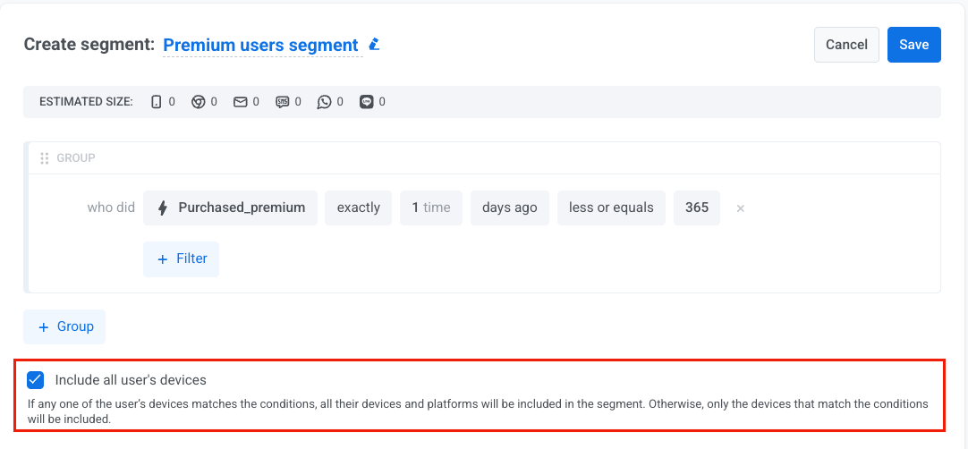 Anchor link toEnable this option to target a user across all their devices, not just the one that matched the segment condition. This ensures they receive your messages on every platform they use.