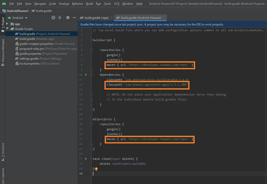 2. Adicione classpath 'com.huawei.agconnect:agcp:1.3.1.300' em buildscript { dependencies }.