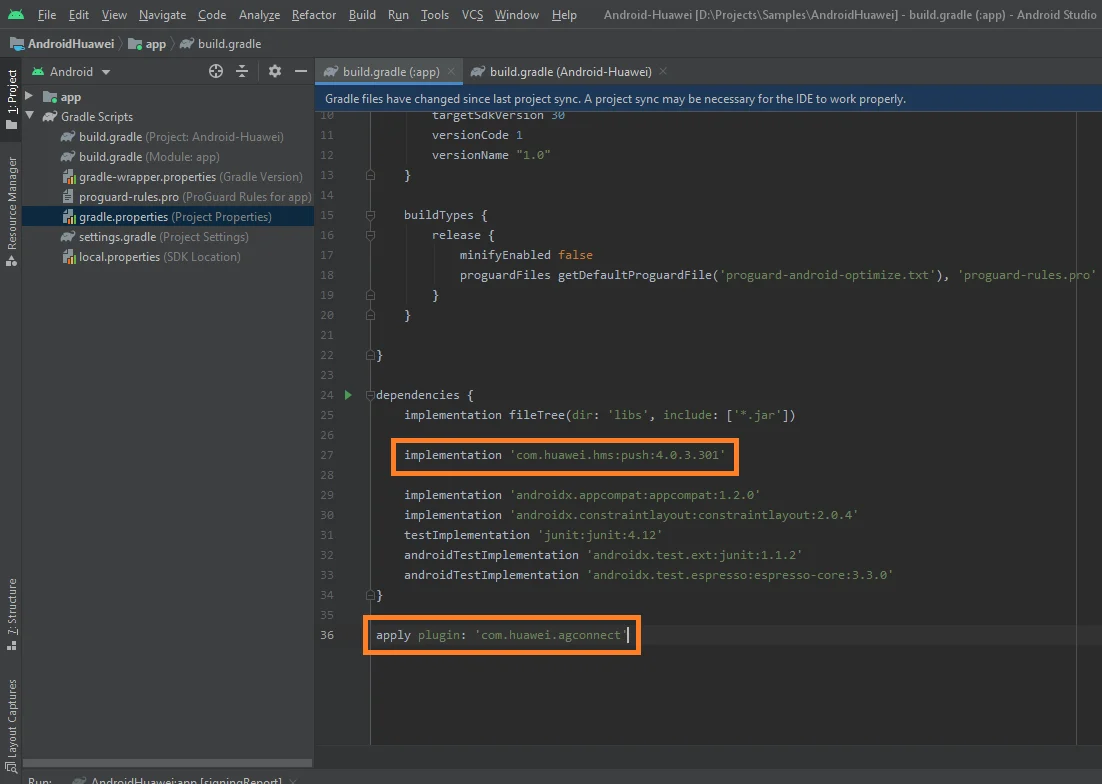 3. Adicione implementation 'com.huawei.hms:push:6.1.0.300' ao seu build.gradle de nível do aplicativo (app/build.gradle) na seção dependencies.
