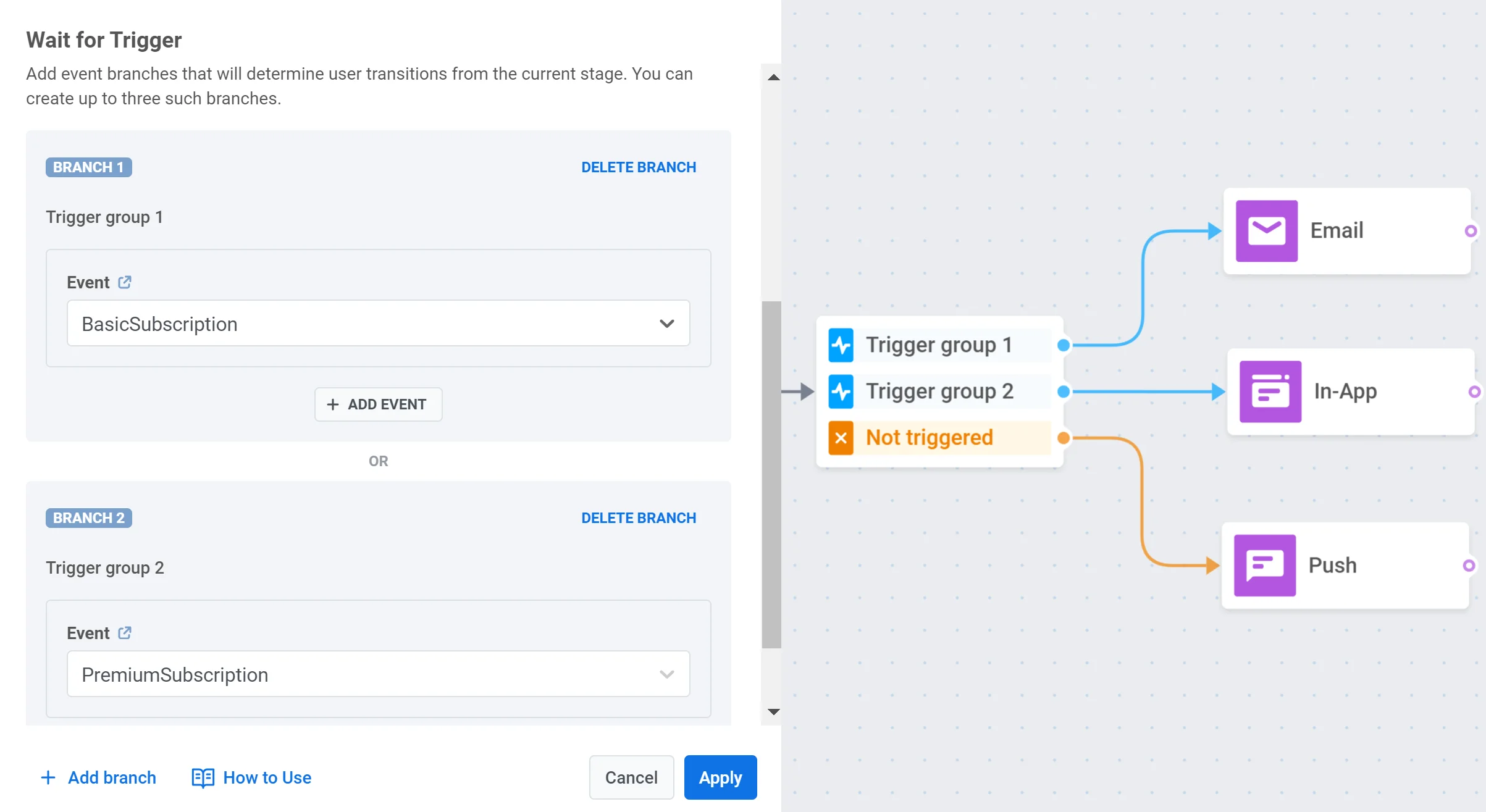 - Agora você pode selecionar o operador E ao adicionar vários eventos a uma ramificação. Se o operador E for usado, apenas os usuários que atenderem a todas as condições especificadas na ramificação prosseguirão.