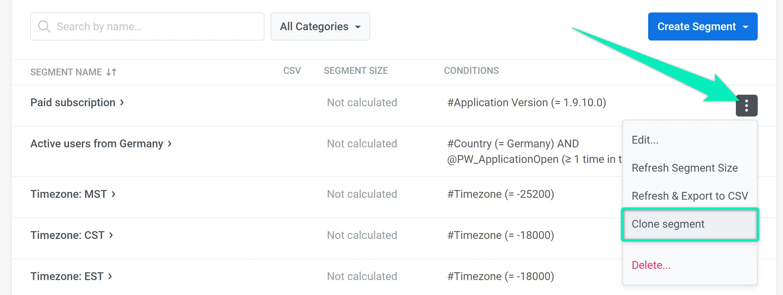 Anchor link toAgora, você pode criar rapidamente um novo segmento com base em um existente usando a opção Clonar segmento. Isso economizará seu tempo ao construir Segmentos com condições semelhantes.