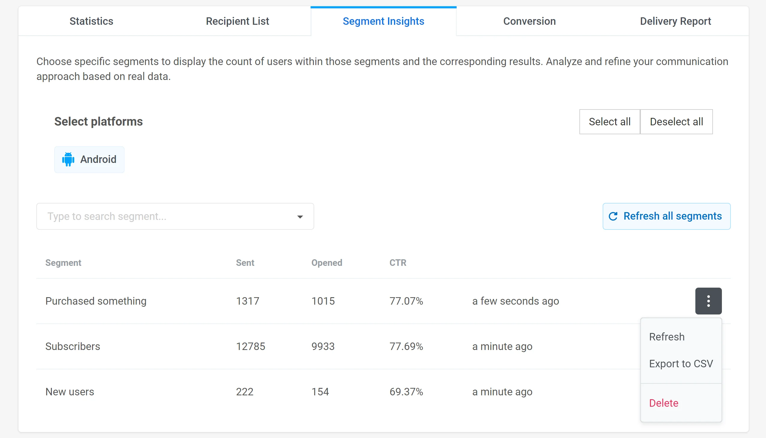 Anchor link toVisualize as estatísticas de mensagens para segmentos de usuários selecionados na aba Segment Insights. Isso ajudará você a analisar e melhorar sua abordagem de comunicação com base nos dados mais precisos.