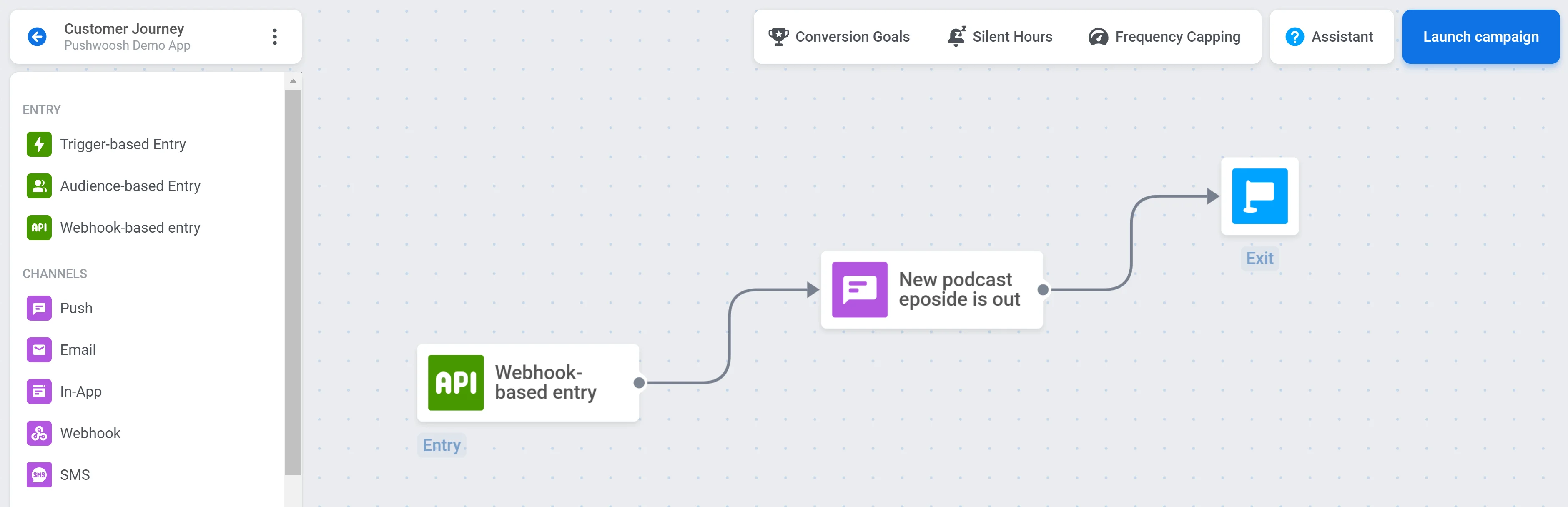 Anchor link toAgora você pode iniciar uma jornada sempre que precisar, enviando uma solicitação de API. Isso pode ser útil se você quiser que a jornada seja iniciada automaticamente assim que algum evento de negócios ocorrer fora do aplicativo. Por exemplo, você pode informar os clientes quando alguns de seus produtos estiverem de volta ao estoque. Na solicitação, você pode especificar condições de segmentação e modificar o conteúdo da mensagem.
