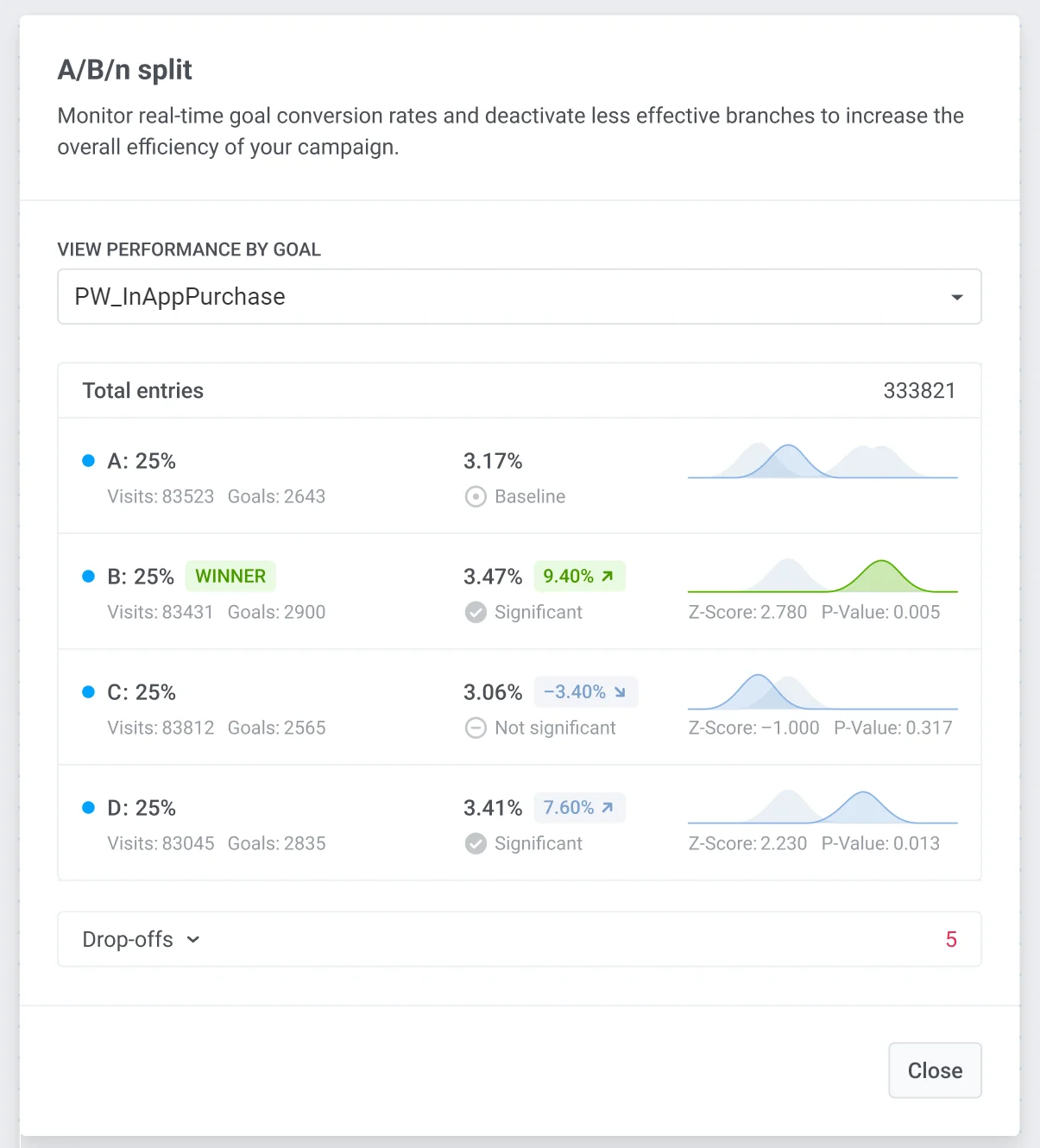 Anchor link to🚀 Seleção automática para vencedores de testes A/B/n: Cansado de verificar manualmente seus testes A/B/n? Deixe-nos cuidar disso! Nosso novo recurso seleciona automaticamente a ramificação vencedora em suas jornadas de cliente. Tudo o que você precisa fazer é definir uma meta, e nós rastrearemos o desempenho de cada caminho. Uma vez que um vencedor claro é encontrado, todos os novos usuários são automaticamente direcionados para a ramificação de melhor desempenho. Isso significa que suas jornadas estão sempre otimizadas para o sucesso, sem nenhum trabalho extra de sua parte. Saiba mais
