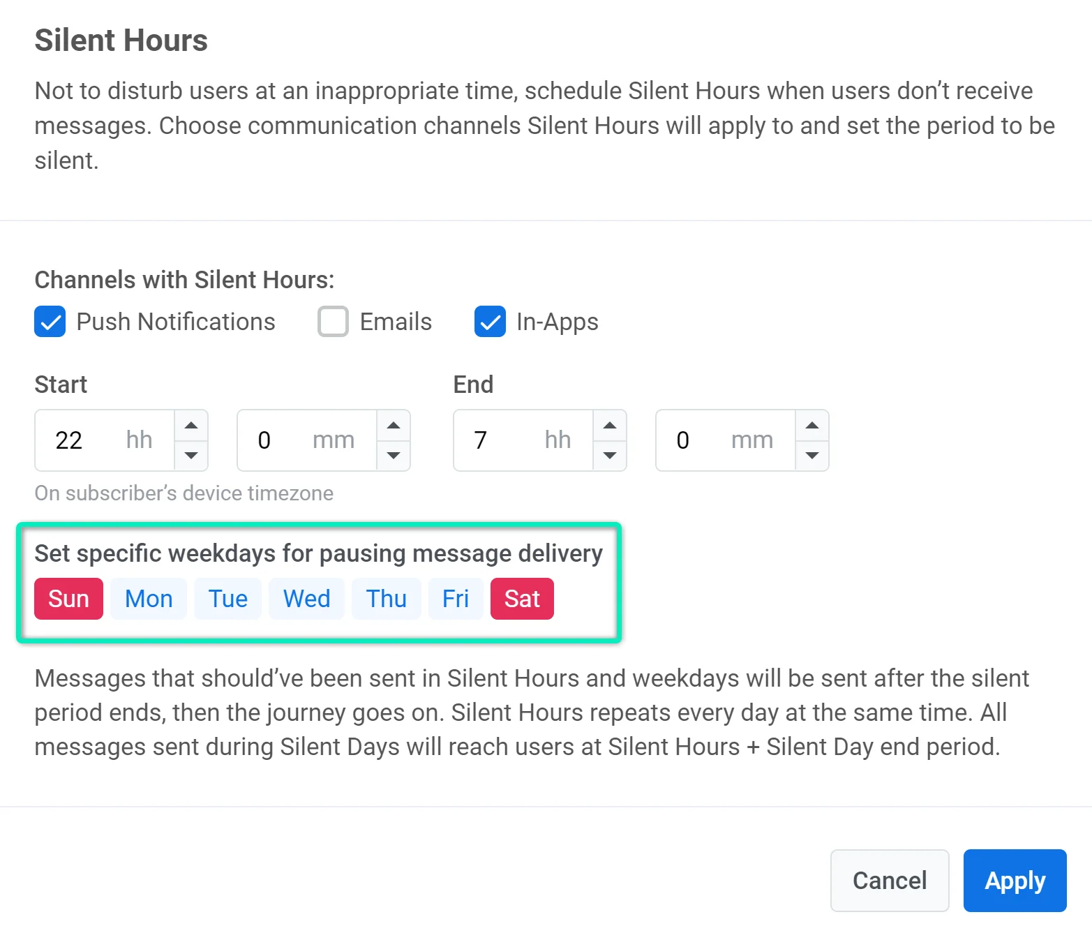 Anchor link toAo configurar as Horas de Silêncio no Construtor de Jornada do Cliente, agora você também pode especificar os dias da semana em que o envio deve ser pausado. Os usuários só receberão mensagens e continuarão sua jornada após o término do período de Horas de Silêncio + Dias de Silêncio. Por exemplo, isso pode ser útil se você não quiser perturbar seus usuários nos fins de semana.