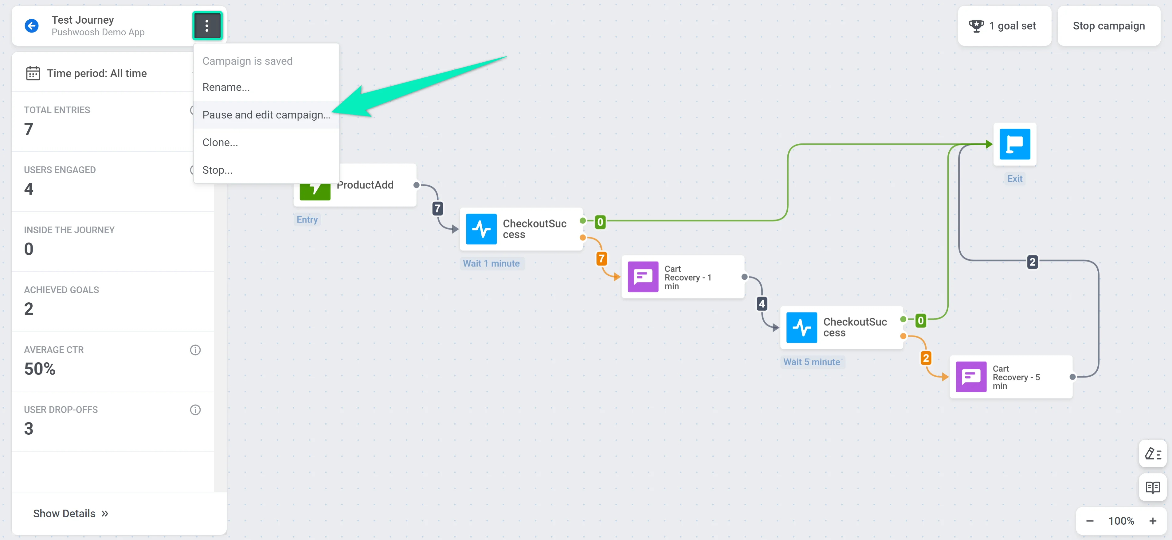 Anchor link toAgora você pode editar quaisquer elementos e configurações de uma Jornada do Cliente que já foi lançada. Uma Jornada deve ser pausada durante a edição e pode ser relançada a qualquer momento. Este novo recurso permitirá que você melhore suas comunicações e ajuste campanhas ativas às necessidades em constante mudança.