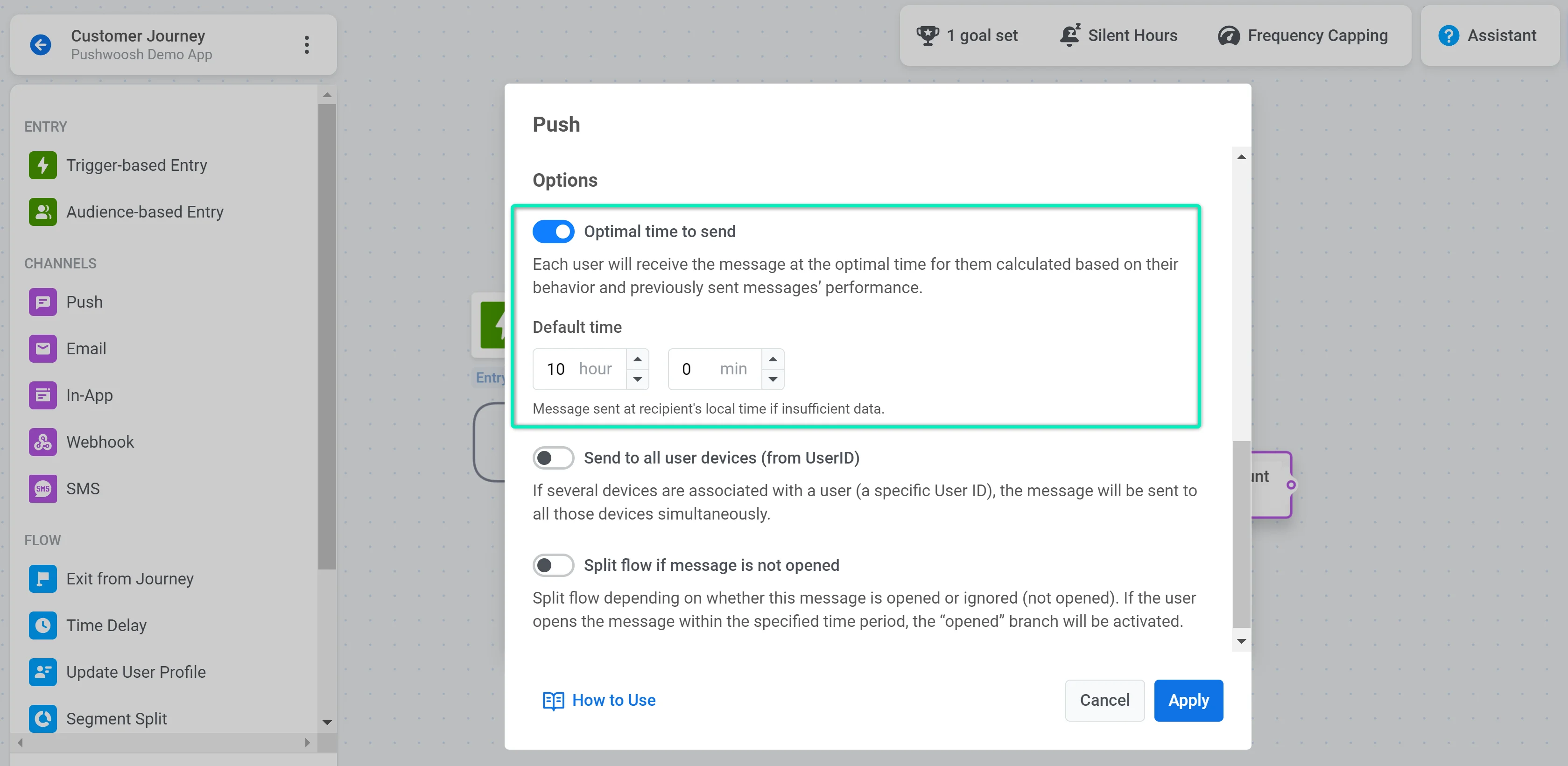 Anchor link toAdicionamos a opção Hora ideal para enviar ao Construtor de Jornada do Cliente: agora o Pushwoosh pode escolher automaticamente quando enviar um push para cada viajante da Jornada com base em seu comportamento e no desempenho de mensagens enviadas anteriormente. Isso ajudará você a tornar suas comunicações mais eficazes.