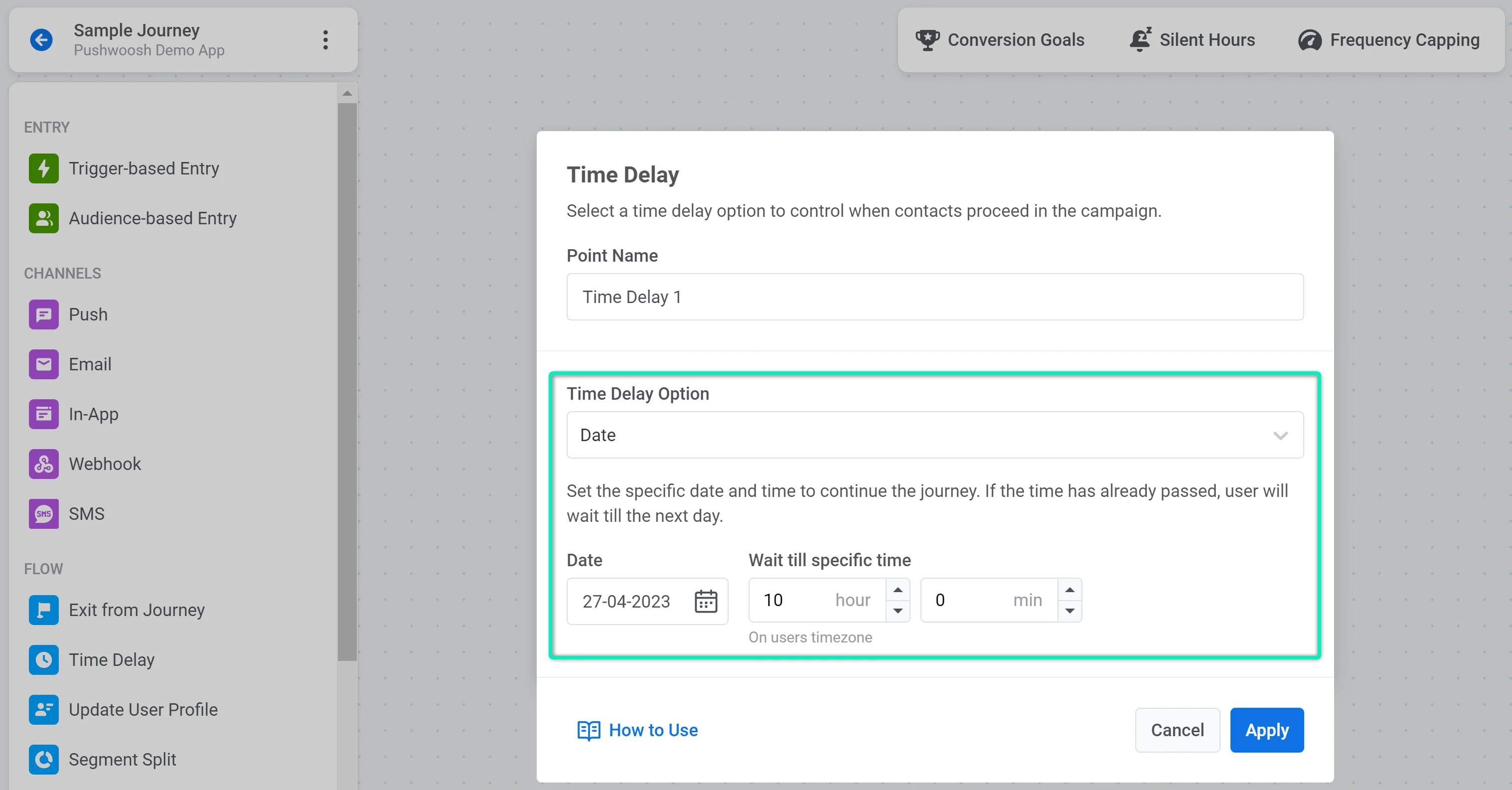 Anchor link toMelhoramos o elemento Atraso de Tempo no Construtor de Jornada do Cliente: agora você pode definir a data e hora específicas para continuar a jornada. Você também pode selecionar um dia específico da semana. Use esta opção para configurar rapidamente campanhas únicas para datas específicas sem calcular manualmente o atraso de tempo.