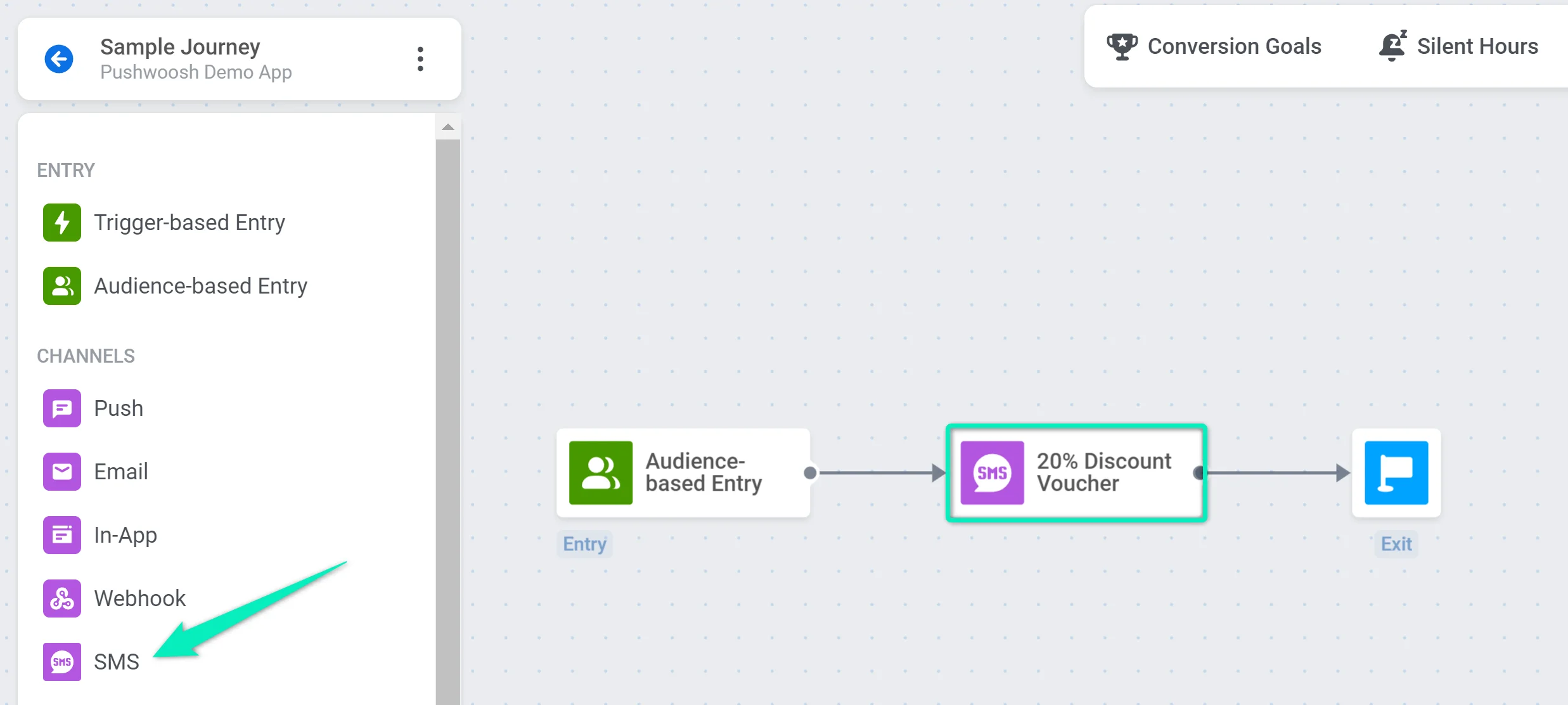 Anchor link toAgora você pode adicionar o canal SMS no Construtor de Jornada do Cliente. Para usar este recurso, entre em contato com nossa equipe de Vendas ou com seu Gerente de Sucesso do Cliente dedicado.