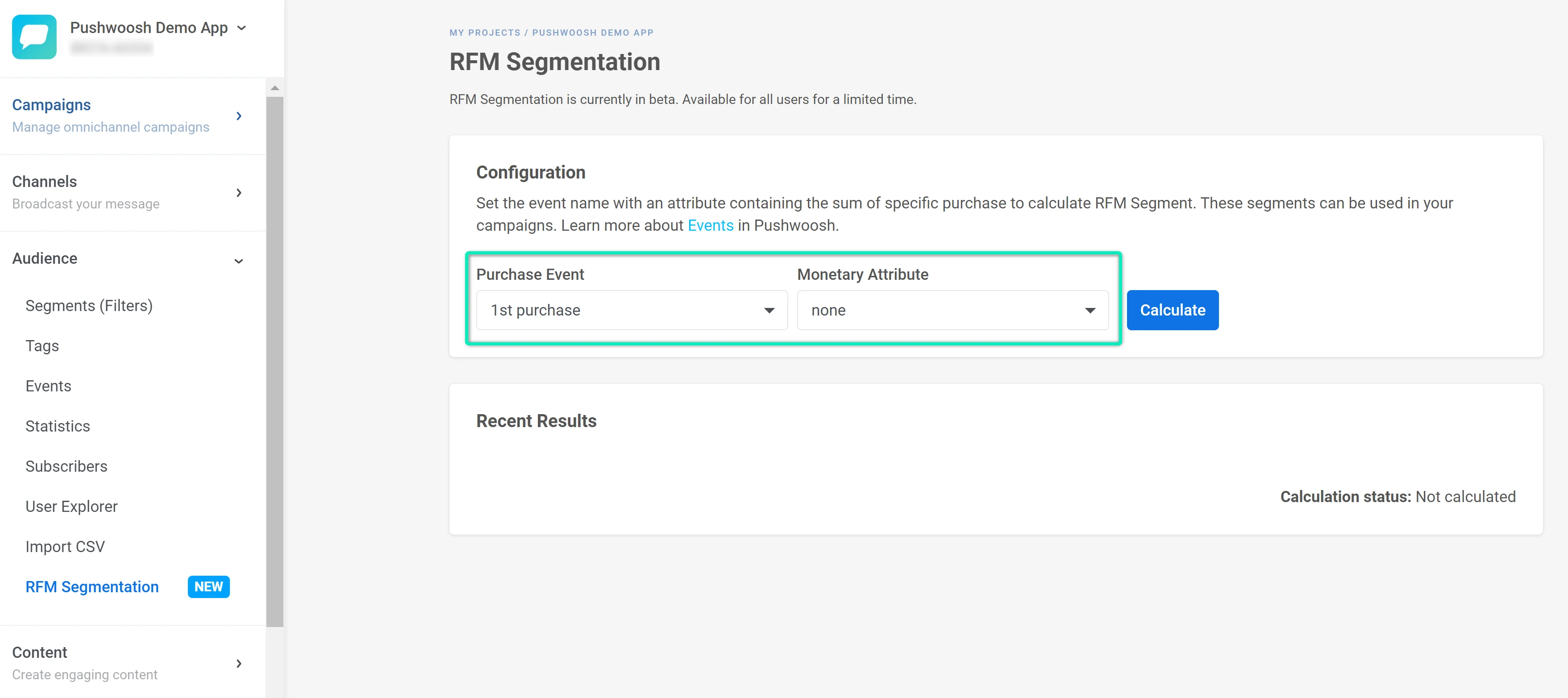Anchor link toNa seção Segmentação RFM, agora você pode construir um segmento baseado em comportamento sem o atributo Monetário. Para fazer isso, selecione “nenhum” como valor do atributo Monetário, e o segmento será calculado com base apenas em Recência e Frequência.