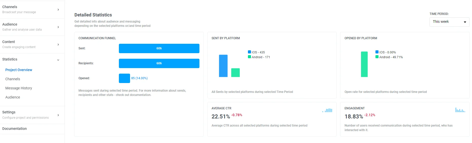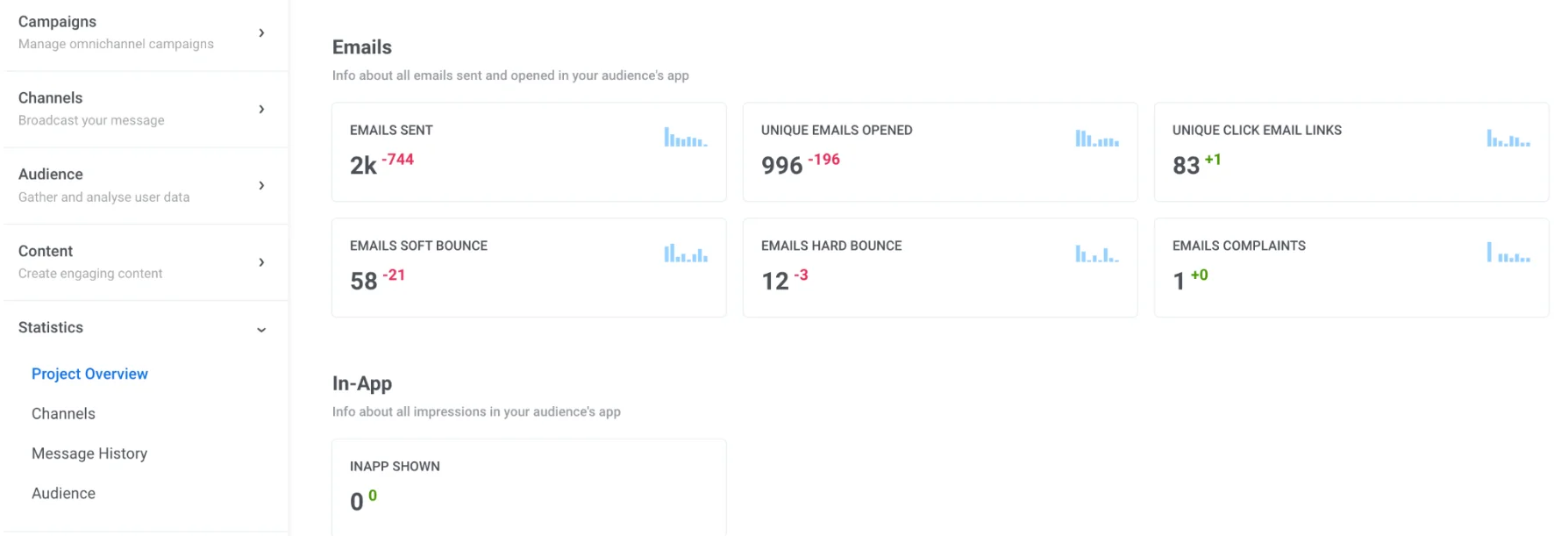 Anchor link toMelhoramos a seção Visão Geral do Projeto para fornecer uma visão clara e focada do desempenho de sua campanha em diferentes canais. Agora, você pode rastrear sem esforço métricas específicas do canal para e-mails, notificações push e mensagens no aplicativo. Também aprimoramos os visuais do gráfico para facilitar a identificação de tendências rapidamente. Para completar, removemos as métricas de Público Total e Público por Plataformas que costumavam confundir muitos de nossos usuários, permitindo que você se concentre nas métricas que importam.