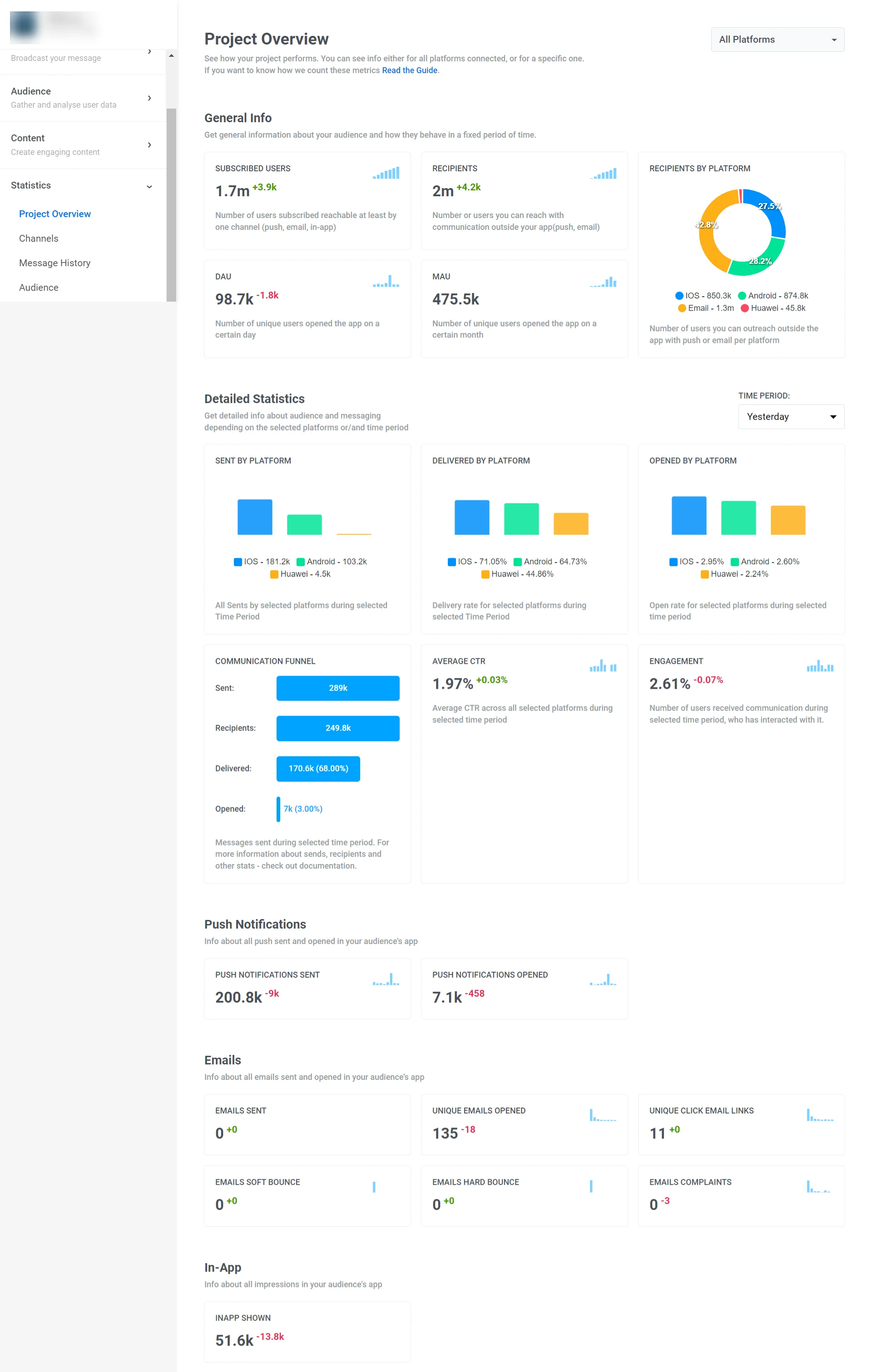 📊 Painel de Visão Geral do Projeto aprimorado: A Visão Geral do Projeto atualizada oferece um instantâneo claro da atividade do seu aplicativo, incluindo métricas chave de público e canais ativos. Acesse rapidamente a criação de mensagens e as configurações do projeto para lançar campanhas mais rapidamente e gerenciar projetos com mais eficiência.