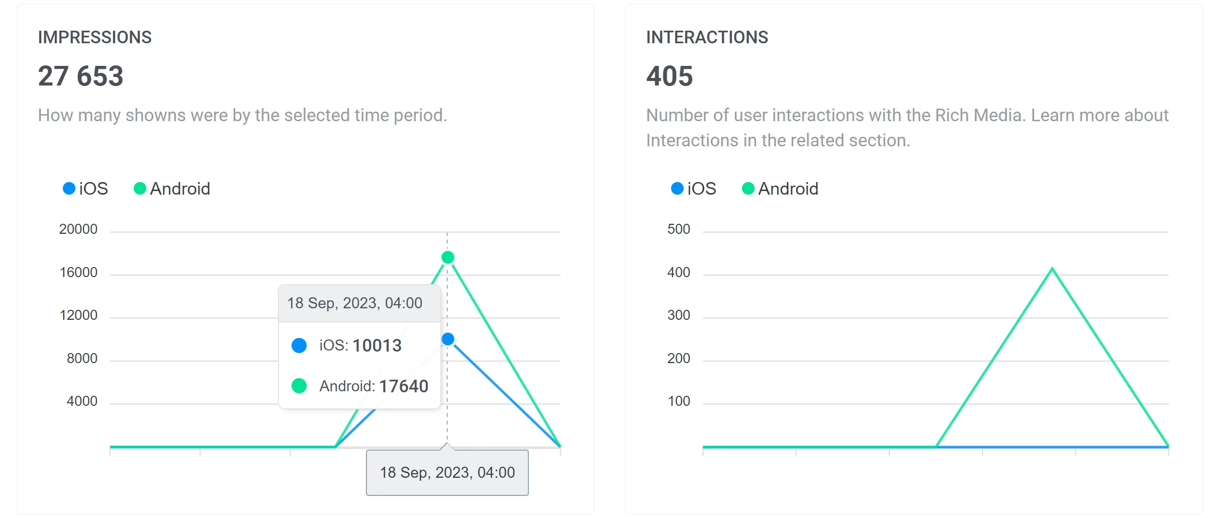 Anchor link toAgora você pode se aprofundar no desempenho de sua Mídia Rica personalizada e rastrear métricas de engajamento do usuário, como cliques em links e botões, e envios de formulários. Esses dados granulares, anteriormente disponíveis apenas para Mídia Rica criada com o editor embutido, capacitam você a refinar sua estratégia de Mídia Rica e obter melhores resultados.