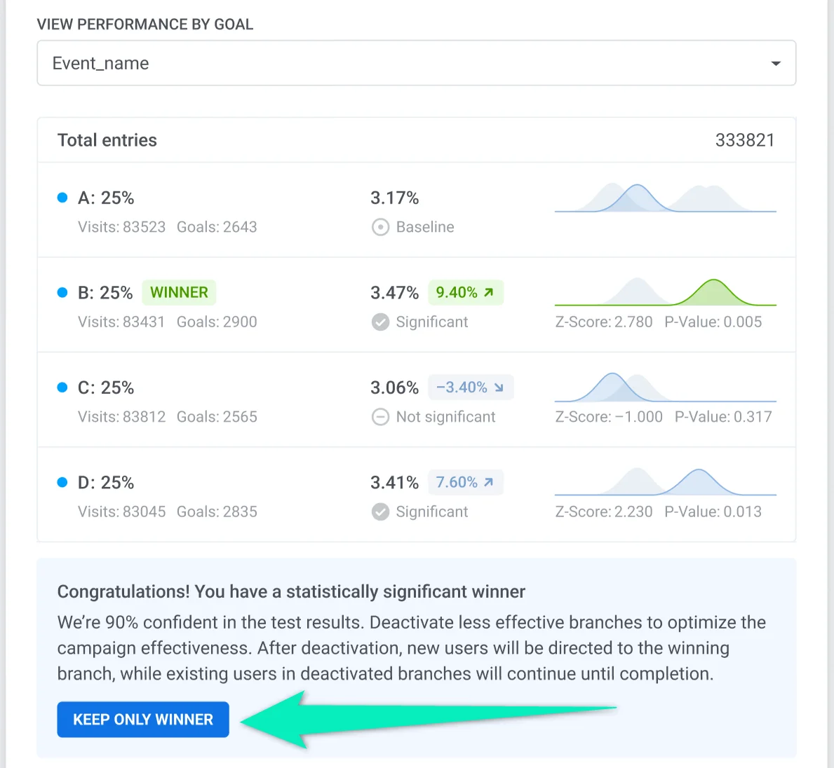 Anchor link toAgora, você pode desativar instantaneamente as ramificações de menor desempenho assim que um vencedor estatisticamente significativo for identificado. Isso ajudará você a otimizar a eficácia da campanha sem pausá-la. Após clicar em Manter apenas o vencedor, os novos viajantes da jornada serão direcionados para a ramificação vencedora, enquanto aqueles que já entraram nas ramificações desativadas continuarão a jornada através delas.