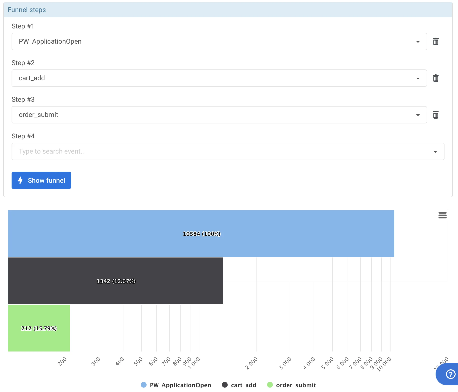 Anchor link toObtenha insights mais profundos sobre como um usuário se comporta após receber uma notificação push com o Funil de Conversão do Pushwoosh. Este novo recurso mapeia visualmente a jornada do usuário, permitindo que você acompanhe as taxas de conversão em cada estágio e otimize suas estratégias de mensagens para obter melhores resultados.